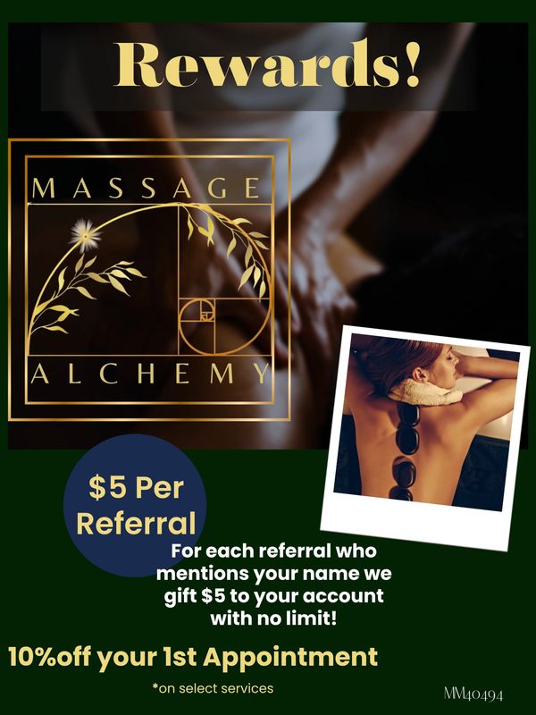 Massage Alchemy is a locally owned therapeutic massage clinic in Spring Hill, FL that put's client relationships first. In this business, we recognize that the word of mouth is invaluable to us thriving among our local community. So, that's why we've decided to reward our amazing clients for something they already do! Every referral that is sent to our office, we reward the client who referred them with $5 onto their account! Also, clients have no limit, and they may be stacked to receive discounted or even free massage therapy services!